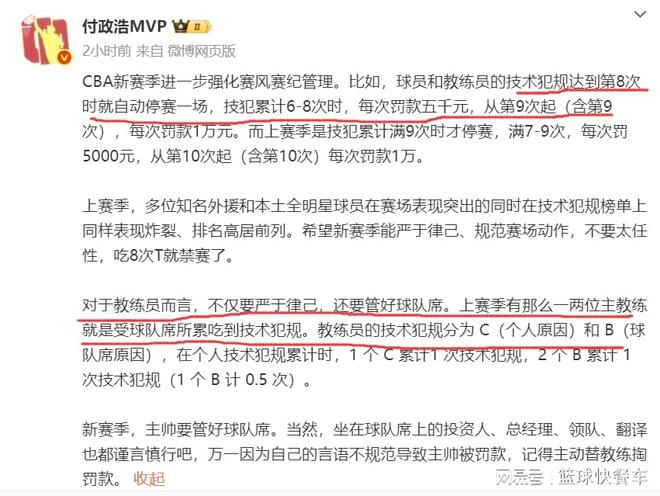 很显然,对于CBA上赛季不少球队的做法,篮协和CBA方面还是不大满意。这不,在2025-26新赛季,篮协和CBA方面就重点强调了球员和教练员的赛场作风。为了让球员和教练员更为“谨慎”,篮协方面针对技术犯规处罚和罚款,又增加了力度。新赛季,无论是球员还是教练员,一旦技术犯规达到6次以上,将会被直接罚款,而达到8次者,将会被自动禁赛一场。