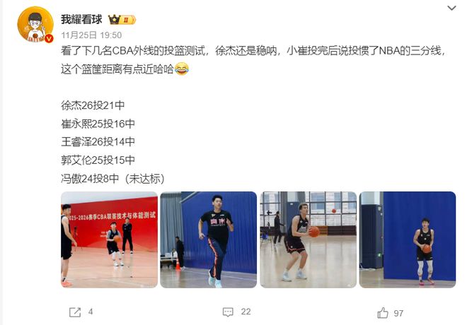 从目前爆料的一些数据能看出崔永熙的恢复状态非常好,CBA外线投篮测试,崔永熙25中16,比王睿泽还出色,徐杰26中21,郭艾伦是25中15。