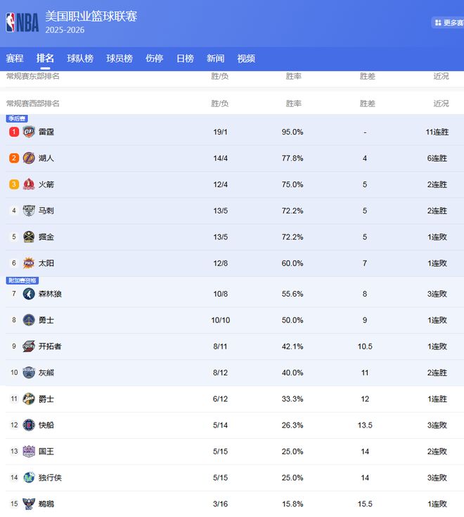 西部最新排名: