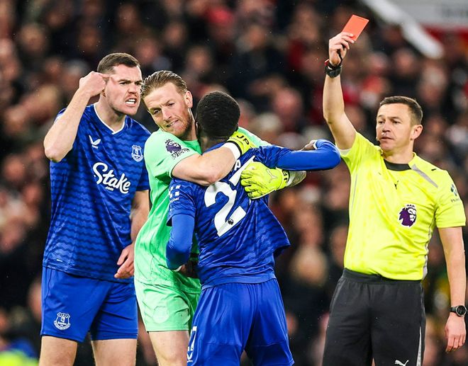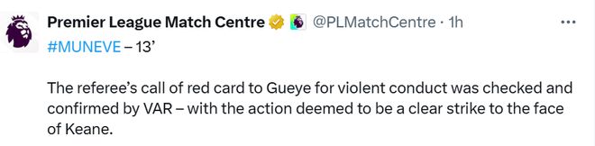 北京时间11月25日04:00,英超联赛第12轮,曼联坐镇主场迎战埃弗顿。上半场13分钟,盖耶与队友基恩发生冲突领红下场。(后续英超官方给出解释:“主裁判认定盖耶实施暴力行为并出示红牌的判罚,经VAR技术核查确认,该动作被判定为对基恩面部的明显击打动作。”)