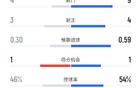 纽卡半场1-0阿森纳数据:射门4-9,射正3-4,控球率46%-54%
